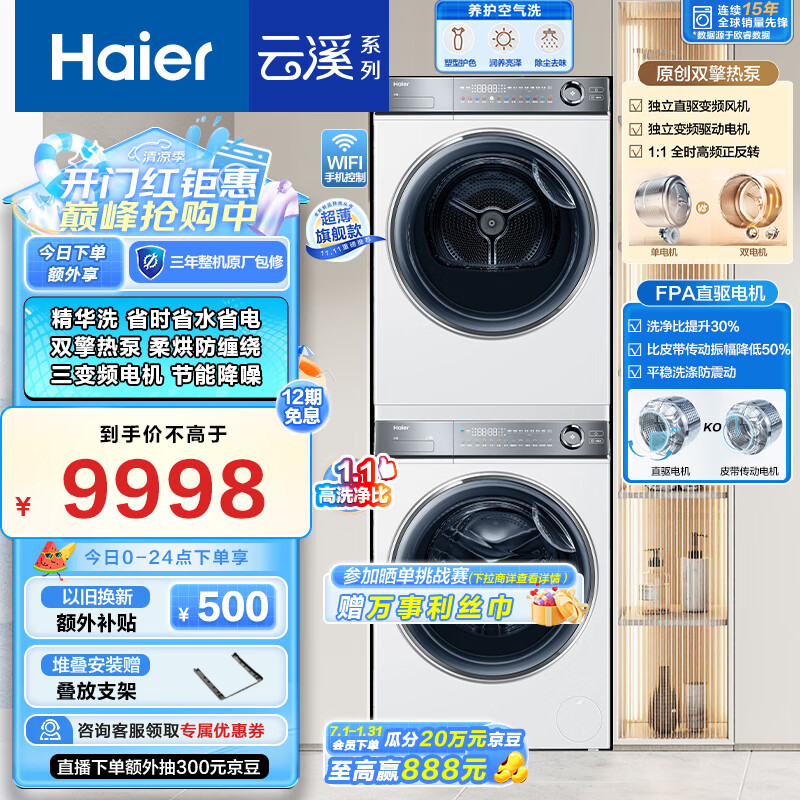 海尔(Haier)云溪376W洗烘套装 10KG精华洗滚筒洗衣机全自动+双擎热泵烘干机 超薄平嵌 376LWU1+376W 以旧换新价格:9998.00元!