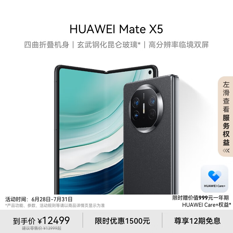 华为(HUAWEI) Mate X5 折叠屏手机 12GB+512GB 羽砂黑价格:12499.00元!