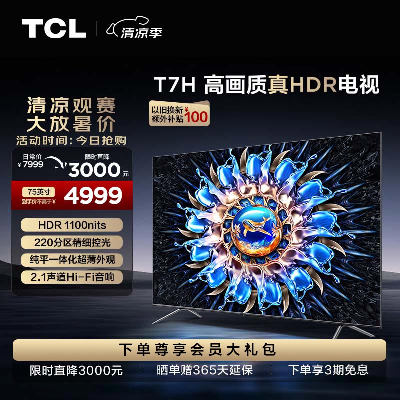 TCL电视 75T7H 75英寸 HDR 1100nits 220分区 4K 144Hz 2.1声道音响 客厅液晶智能平板游戏电视机价格:4999.00元!