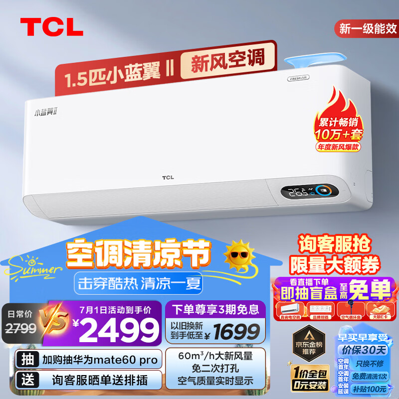 TCL新风空调1.5匹新一级 变频冷暖60m3/h大新风量小蓝翼Ⅱ卧室挂机 KFRd-35GW/D-SWA11Bp(B1)一价全包价格:2450.00元!