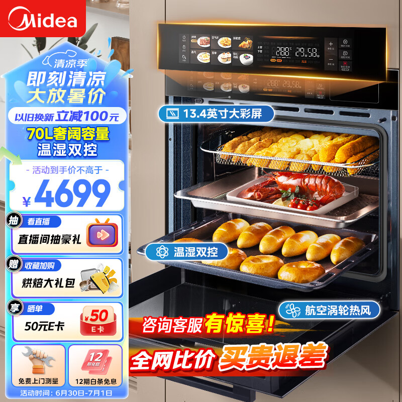 美的70L大容量嵌入式蒸烤箱一体机 航空涡轮热风 温湿双控 13.4英寸大彩屏 蒸烤炸炖4合1体SX7价格:4699.00元!