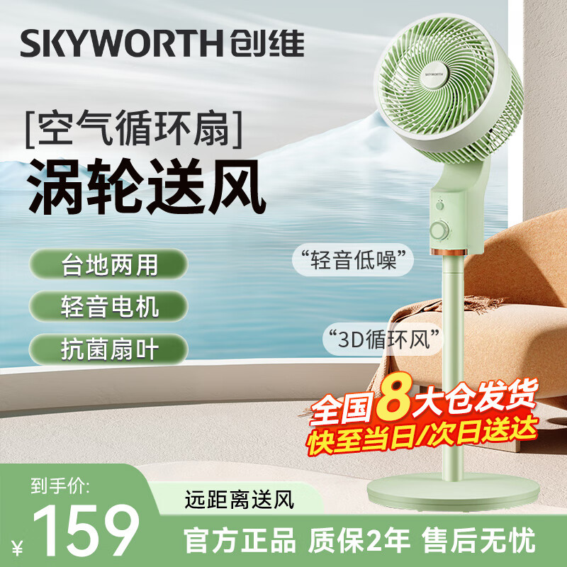 创维(Skyworth)空气循环扇落地扇智电风扇家用大风力轻音台地两用循环风扇Q858小清绿价格:159.00元!