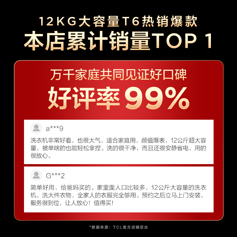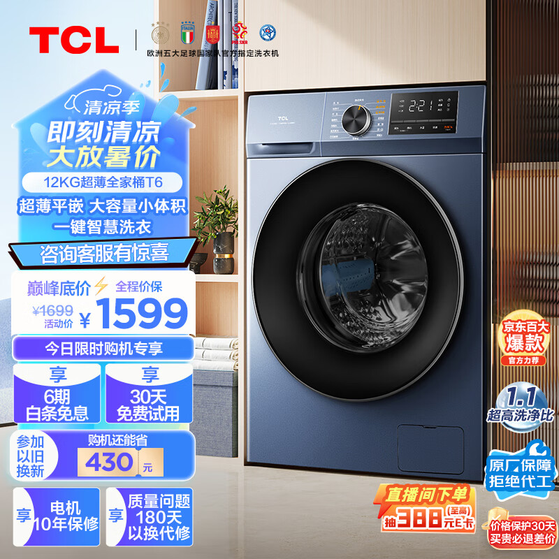 TCL 12KG超薄全家筒T6 大容量洗衣机 除菌除螨 洗净比1.1 超薄嵌入 变频滚筒洗衣机 G120T6-B价格:1699.00元!