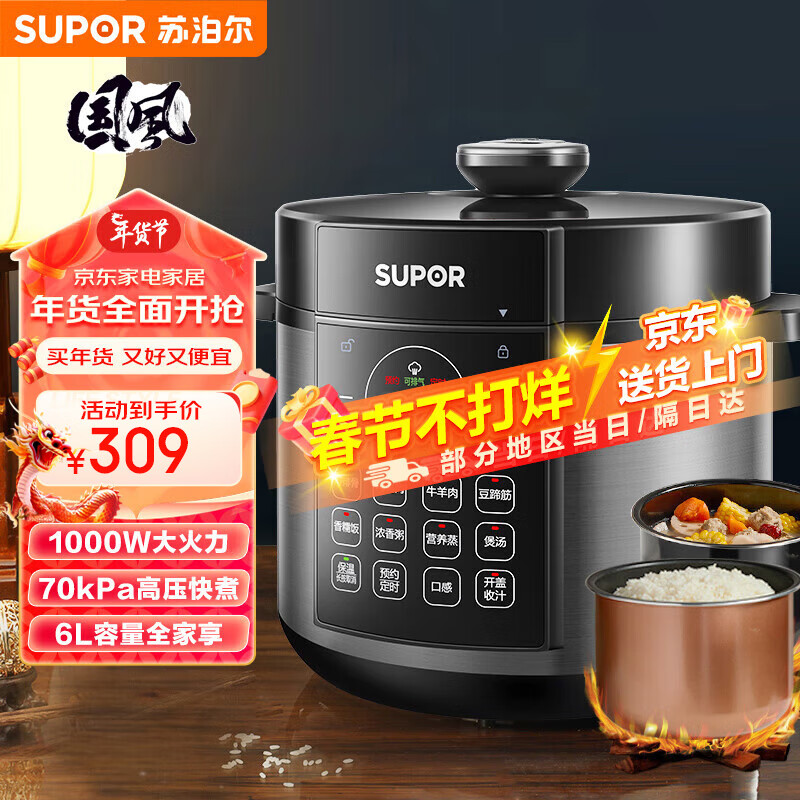 苏泊尔(SUPOR)国潮系列电锅 6L大容量全自动智能预约 家用煲汤 面板易清洁双内胆60YC8086电饭煲高压锅4-8人价格:379.00元!