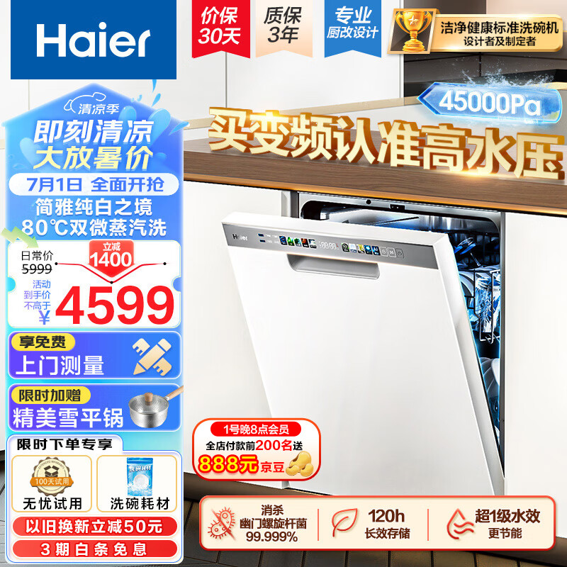 海尔(Haier)15套嵌入式洗碗机白日梦想家W30S 变频一级水效 升降碗篮 分区洗 智能开门速干EYBW153286ZBU1价格:4599.00元!