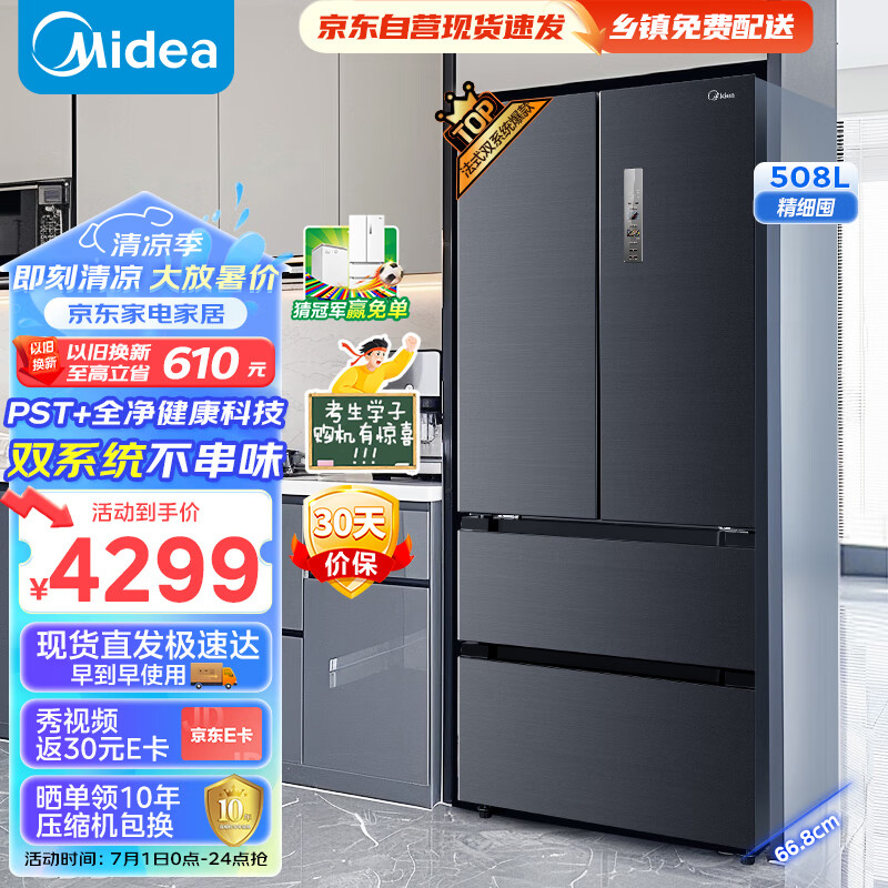 美的(Midea)508升变频一级能效法式四开门双系统双循环多门除菌净味冰箱大容量BCD-508WTPZM(E)莫兰迪灰价格:4799.00元!