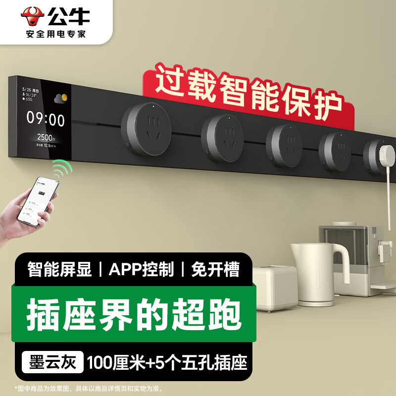 公牛(BULL)明装 轨道插座 大师屏显款可移动墙壁插座壁挂式插座 免打孔APP控制 100厘米轨道+5个五孔灰价格:1058.00元!