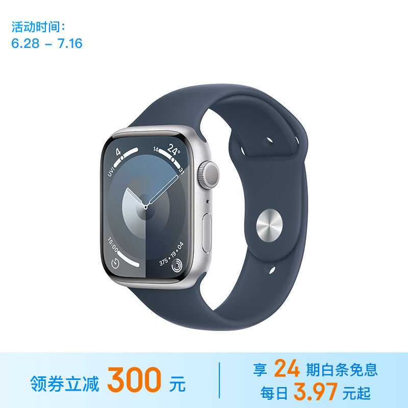 Apple【24期免息】Watch Series 9智能手表GPS款45毫米银色铝金属表壳风暴蓝色表带M/L MR9E3CH/A价格:3199.00元!