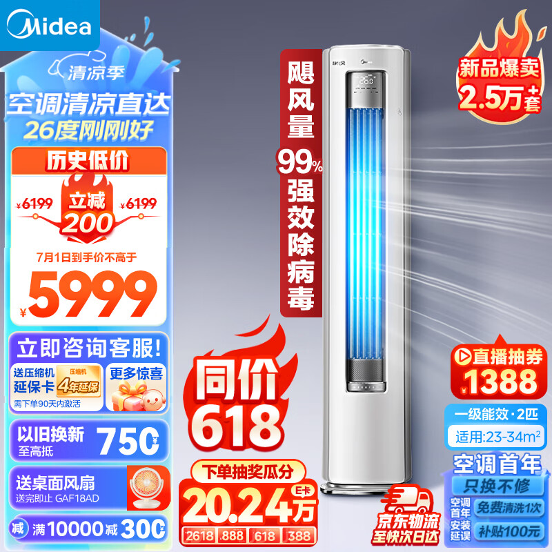 美的(Midea)空调 2匹 静优风 新一级能效 变频冷暖 除湿 空调立式 客厅空调立式柜机 KFR-51LW/N8HY1-1价格:5999.00元!