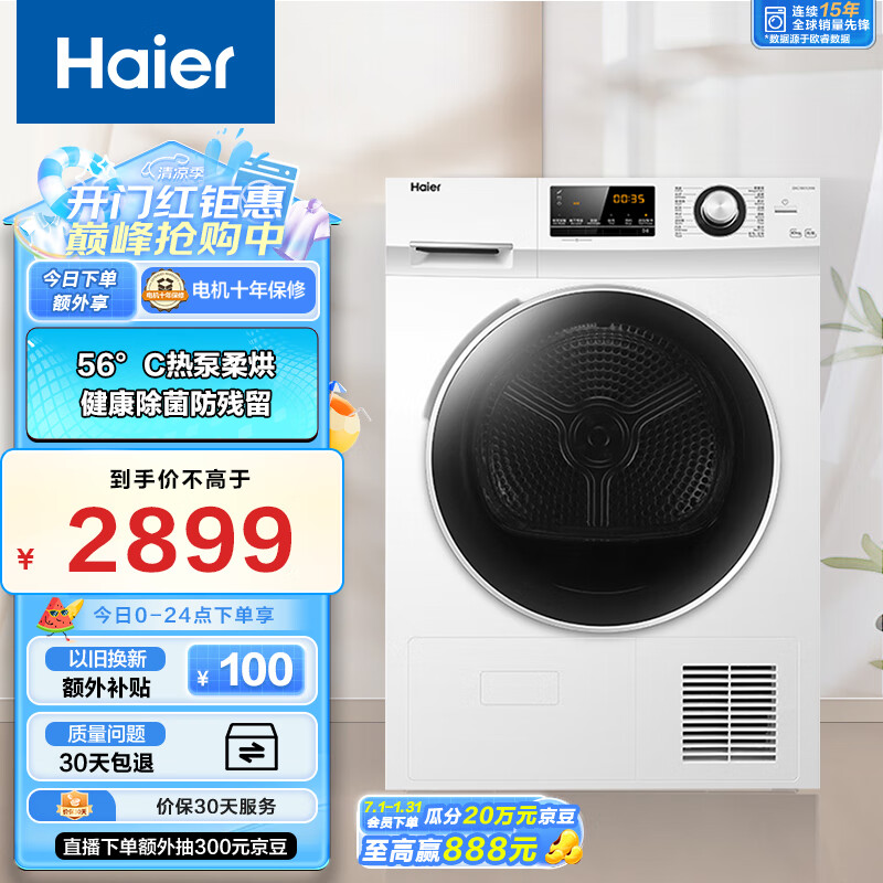 海尔(Haier)129W烘干机家用 10KG热泵式干衣机烘衣机 速烘节能 除菌除潮 防缠绕除毛屑 EHG100129W 以旧换新价格:2899.00元!