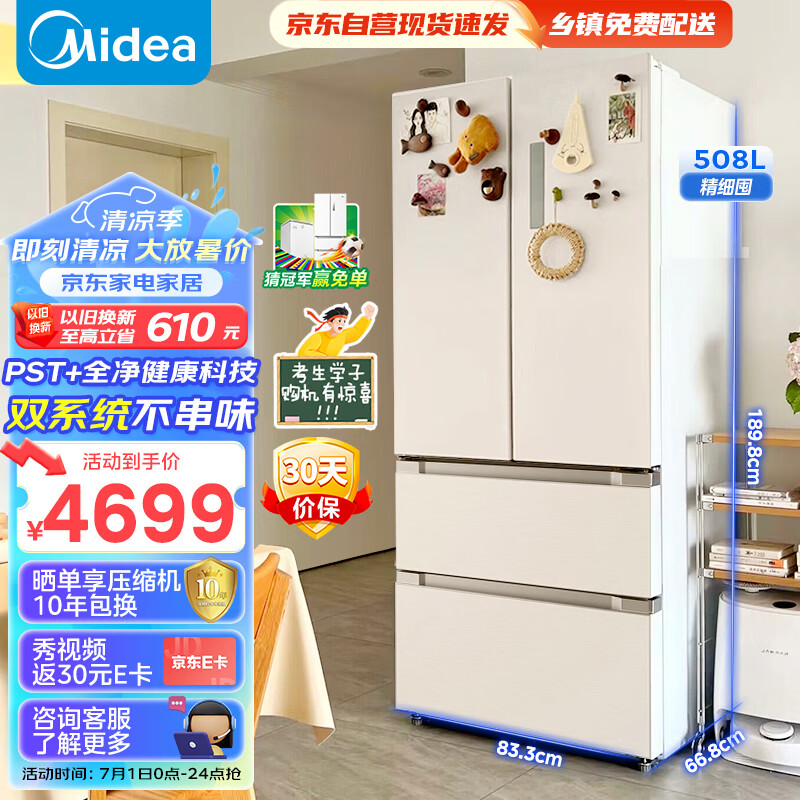 美的(Midea)508升变频一级能效法式四开门多门双系统双循环除菌净味家用冰箱大容量BCD-508WTPZM(E)白色价格:5199.00元!