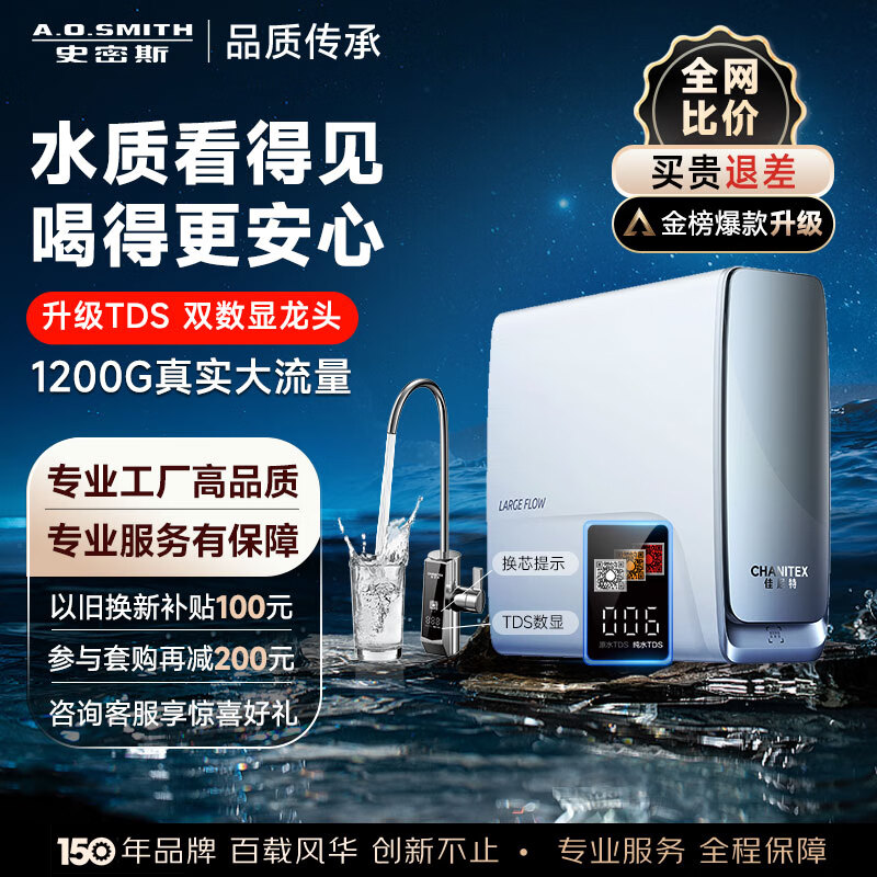 史密斯(A.O.SMITH)佳尼特净水器蓝鲸3000家用厨下式直饮净水机反渗透3升/分钟升级TDS双数显1200G CR3000AB1价格:3799.00元!