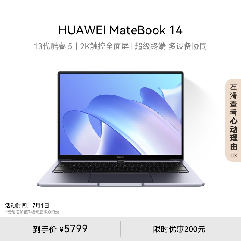 华为MateBook 14笔记本电脑 13代酷睿/2K触控屏/14英寸轻薄办公本/超级终端 i5 32G 1T 深空灰价格:5799.00元!