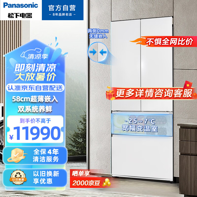 松下(Panasonic)大白PRO464升家用多门冰箱四开门一级能效双系统双循环58cm超薄嵌入法式冰箱NR-EW46TGB-W珍珠白价格:11990.00元!