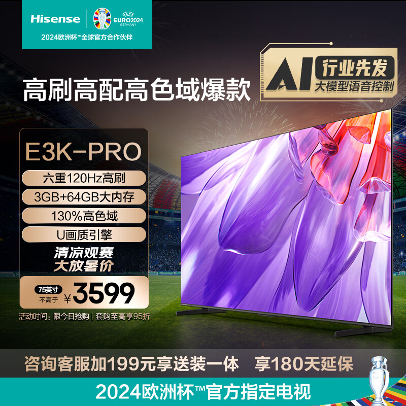 海信电视75E3K-PRO 75英寸 4K六重120Hz高刷 130%高色域 U画质引擎 智慧屏 液晶平板电视机 欧洲杯价格:3599.00元!