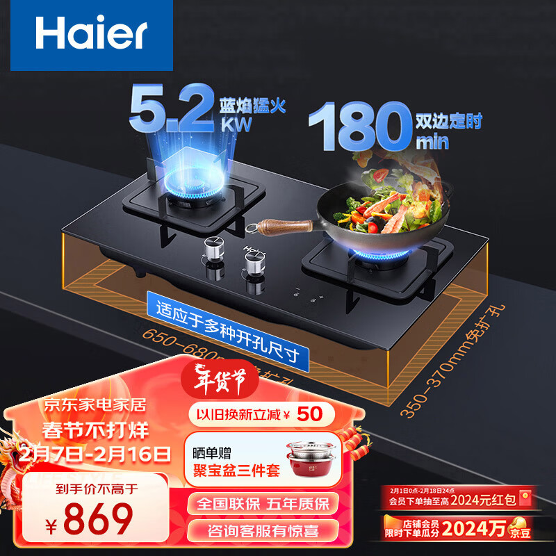 海尔(Haier)燃气灶天然气 家用双灶具5.2kW瞬燃猛火 180min智能定时 以旧换新搭配可调节底壳Q2BE7(12T)价格:799.00元!