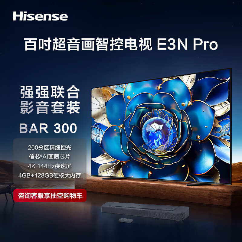 海信电视E3N Pro +BAR300沉浸追剧套装 100英寸 百级分区控光 信芯AI画质芯片 液晶智慧屏价格:15098.00元!