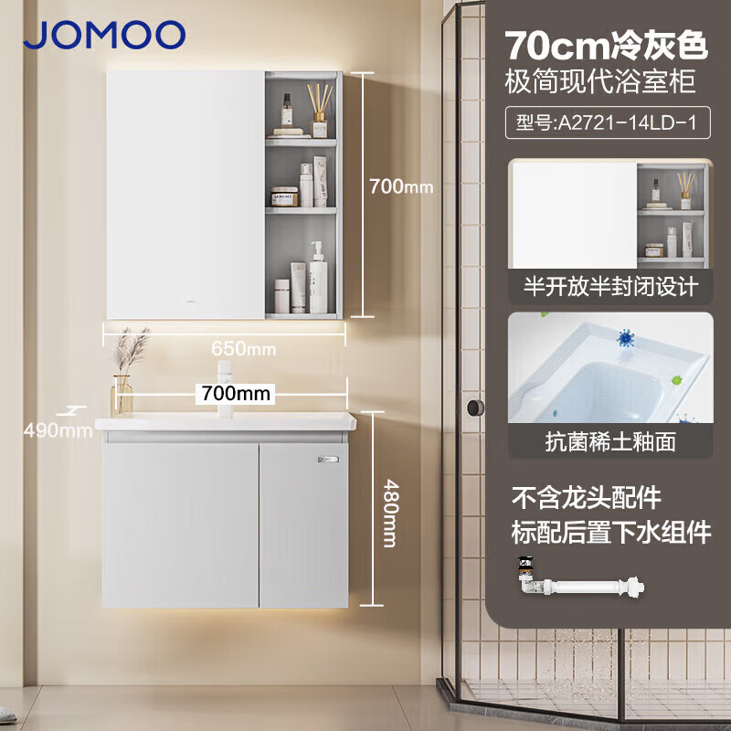 九牧(JOMOO)浴室柜 陶瓷一体盆抗菌悬挂洗脸盆柜组合 冷灰70cm A2721-14LD-1价格:1649.00元!