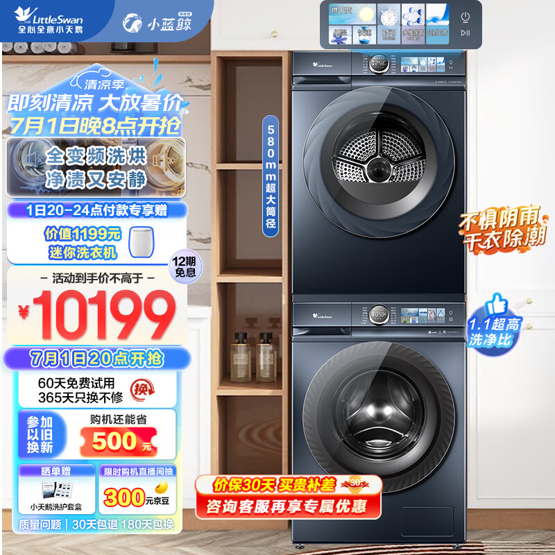 小天鹅(LittleSwan)洗烘套装 10KG滚筒洗衣机+热泵烘干机 超薄全嵌【小蓝鲸青春MAX全变频】TG100V86PLUS+88PLUSMAX价格:10499.00元!