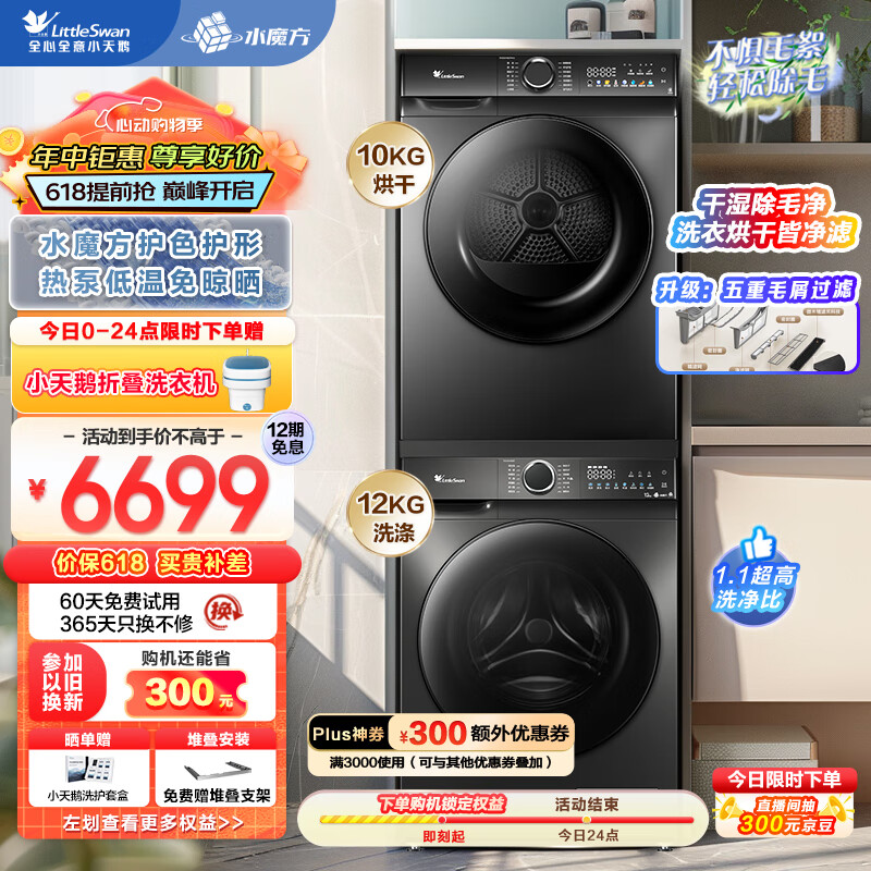 小天鹅(LittleSwan)水魔方洗烘套装 12KG滚筒洗衣机全自动+10KG热泵烘干机 除菌除螨除毛 TG120V618T+617MAX价格:6699.00元!