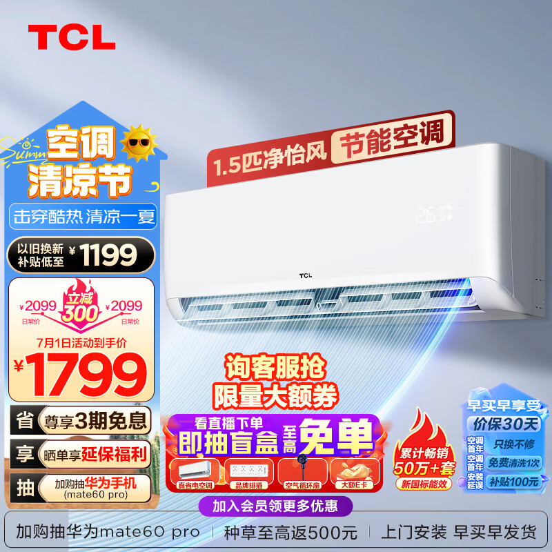 TCL 空调1.5匹 新国标能效 变频冷暖 卧室壁挂式空调挂机KFRd-35GW/D-STA12Bp(B3) 以旧换新价格:1780.00元!