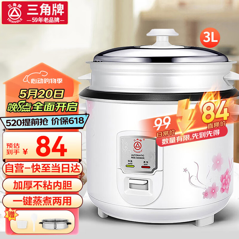 三角牌(Triangle)电饭煲 家用电饭煲老式电饭锅大容量带蒸笼柴火饭米饭锅小煮饭锅3-4-5-6人l 3升价格:99.00元!