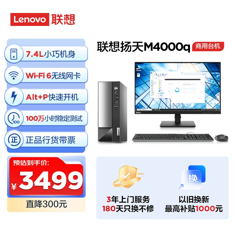 联想(Lenovo)扬天M4000q 商用办公台式电脑主机(酷睿13代i3-13100 16G 1T+512G SSD)23英寸价格:3499.00元!