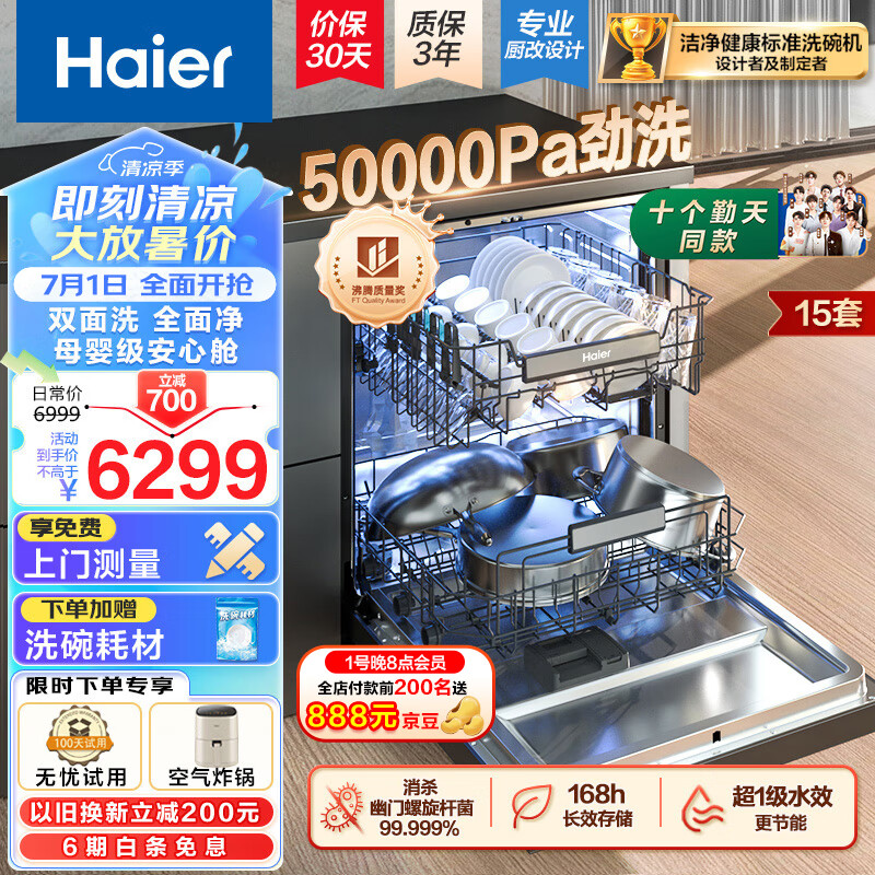 海尔(Haier)15套嵌入式双面洗健康洗碗机W5000 变频高压双一级水效 三重洁净 智能开门速干EYBW152266BKU1价格:6299.00元!
