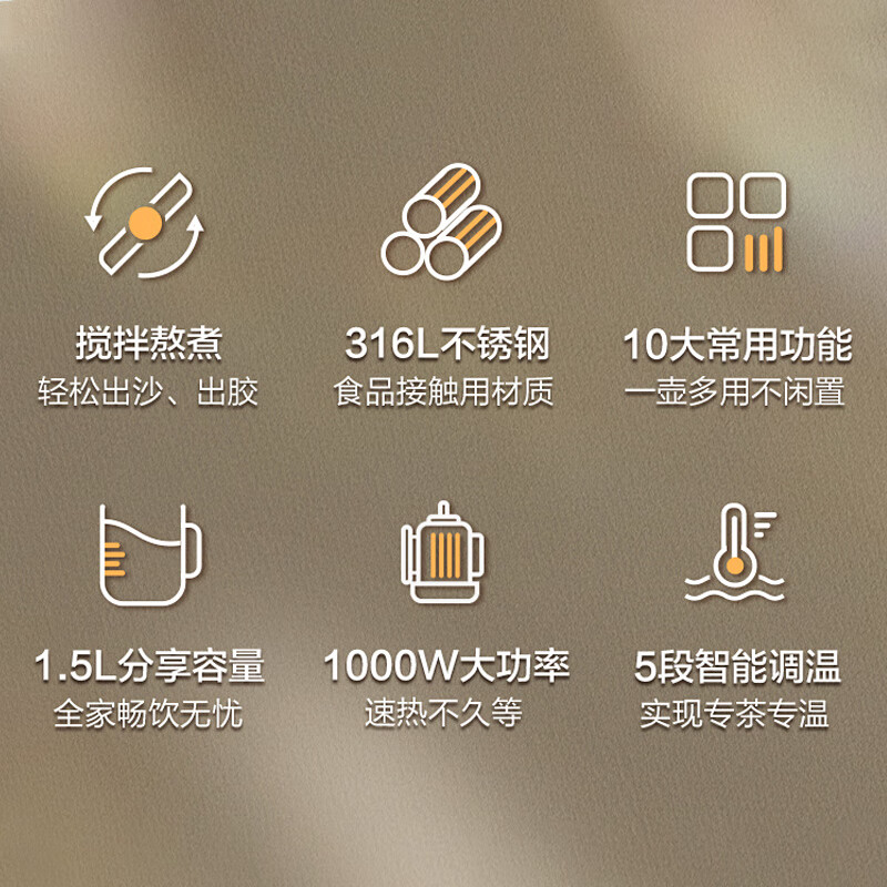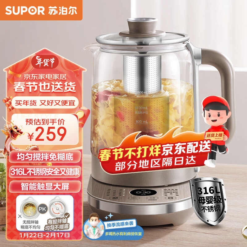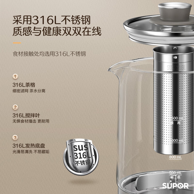 苏泊尔(SUPOR)养生壶1.5L煮茶器 玻璃电茶壶 316L不锈钢电水壶烧水壶花茶壶保温 搅拌熬煮 SW-15YT06 新年礼物价格:259.00元!