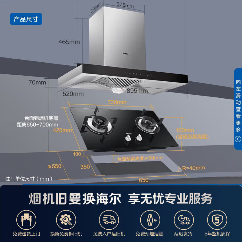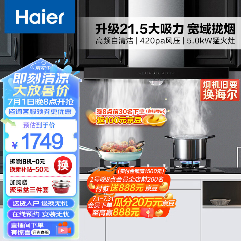 海尔(Haier)抽油烟机 烟灶套装 升级21.5m3/min大吸力 挥手智控自旋洗 欧式家用吸油烟机燃气灶T11+Q2BE2(天)价格:1749.00元!