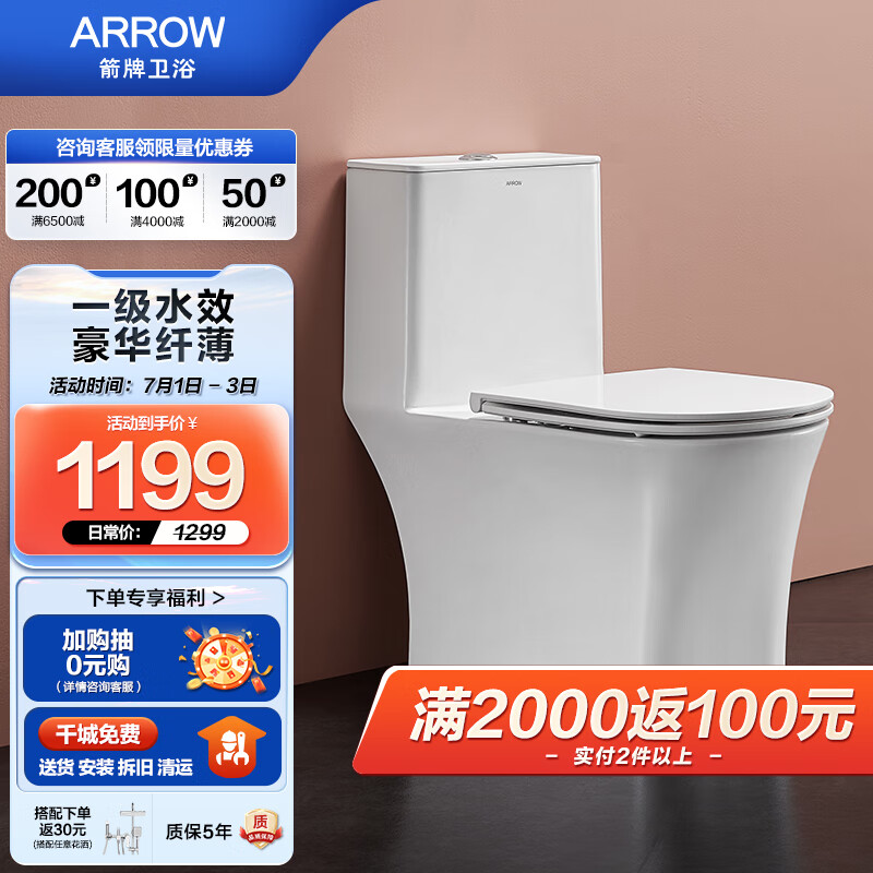 箭牌(ARROW)马桶家用卫浴虹吸抽水坐便器普通坐厕 全管施釉 豪华纤薄AE1182L价格:1239.00元!