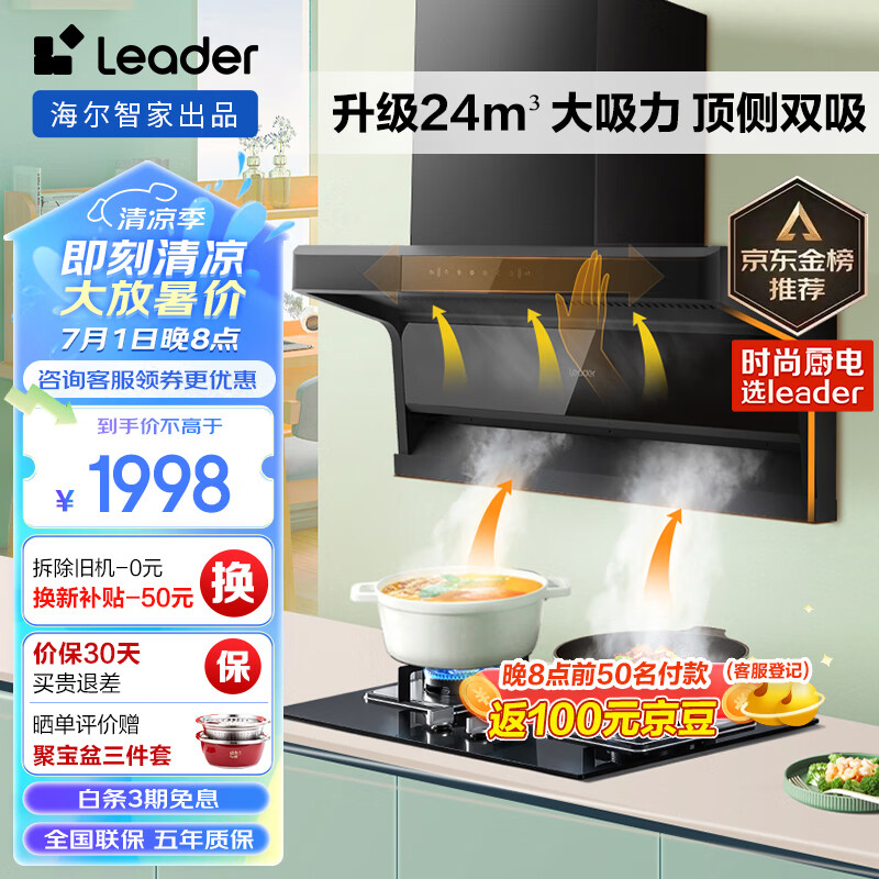 海尔出品油烟机 顶侧双吸抽油烟机燃气灶套装 leader 24风量大吸力挥手智控 以旧换新IQ92D+Q2BE1(天)价格:1998.00元!