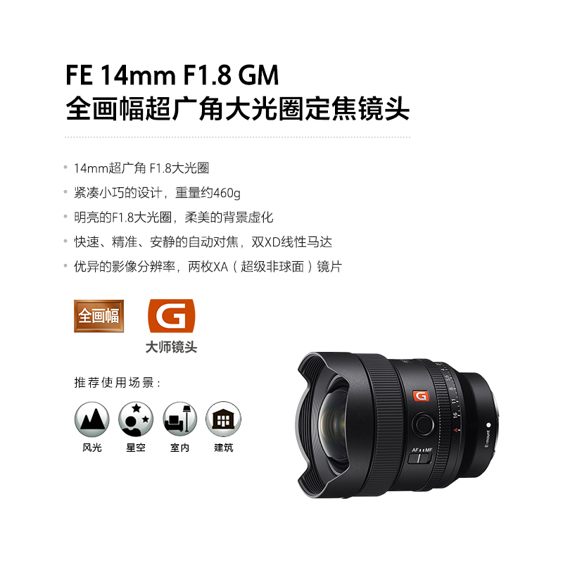 索尼(SONY)FE 14mm F1.8 GM 全画幅超广角大光圈定焦G大师镜头 (SEL14F18GM)价格:11009.28元!