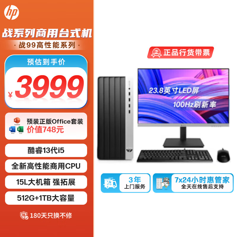 惠普战99 图文设计 办公学习 台式电脑主机(酷睿13代i5-13500 16G 512G+1T)23.8英寸 14核高性能价格:3999.00元!