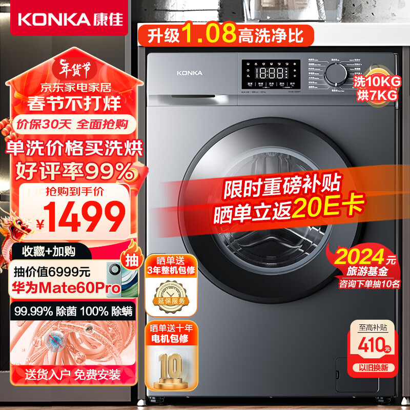康佳(KONKA)洗衣机10KG超薄全自动滚筒洗衣机 洗烘一体机 内衣洗衣机 上排水 烘干除螨大容量 KH100-1202BPT价格:1499.00元!