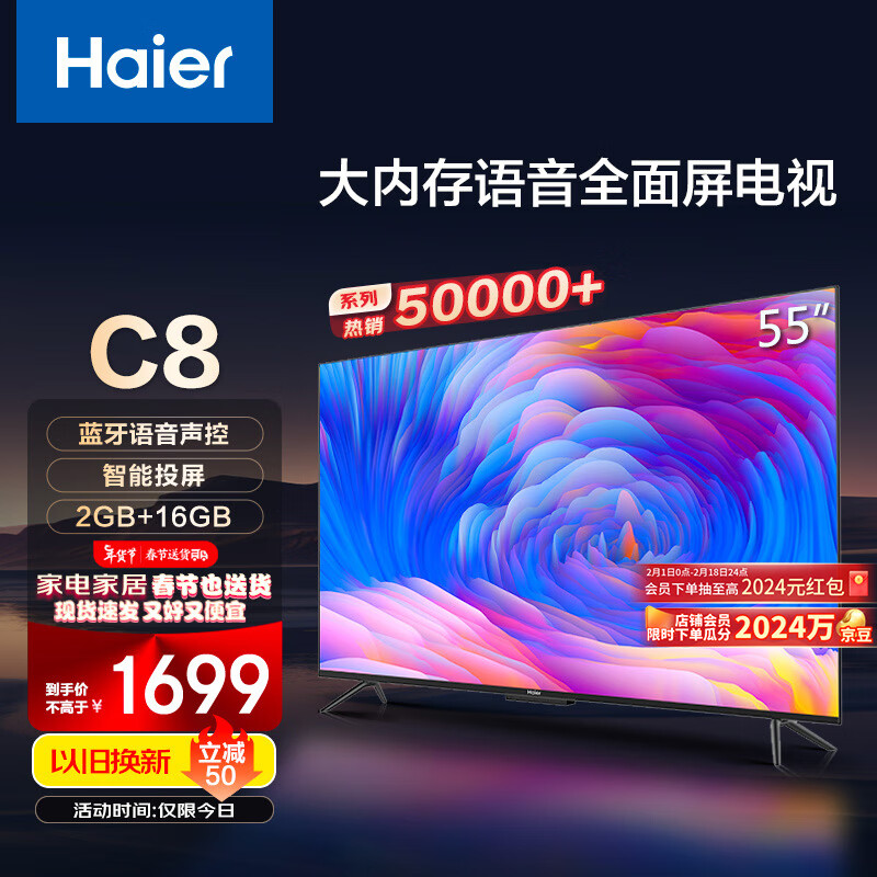 海尔(Haier)LU55C8 55英寸4K屏幕智能音画质客厅平板液晶电视机家用彩电AI远场语音2+16G以旧换新65价格:1686.00元!