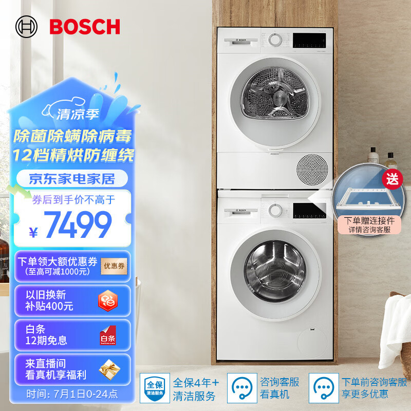 博世(BOSCH)【云朵白主推】洗烘套装10KG云朵白大容量全自动洗衣机热泵烘干机一级能效防缠绕 152000+252U0A价格:8309.00元!