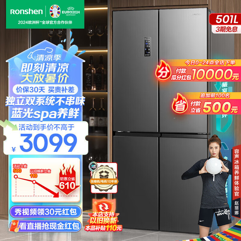 容声(Ronshen)501升双循环十字对开门家用风冷无霜变频一级能效大容量嵌入式四开门电冰箱独立双系统离子净味价格:3699.00元!
