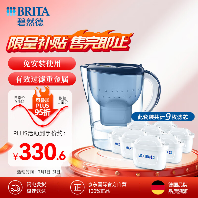 碧然德(BRITA) 滤水壶Marella蓝色3.5L 1壶9芯套装 海洋系列 家用过滤自来水净水器 净水壶配9只滤芯价格:356.00元!