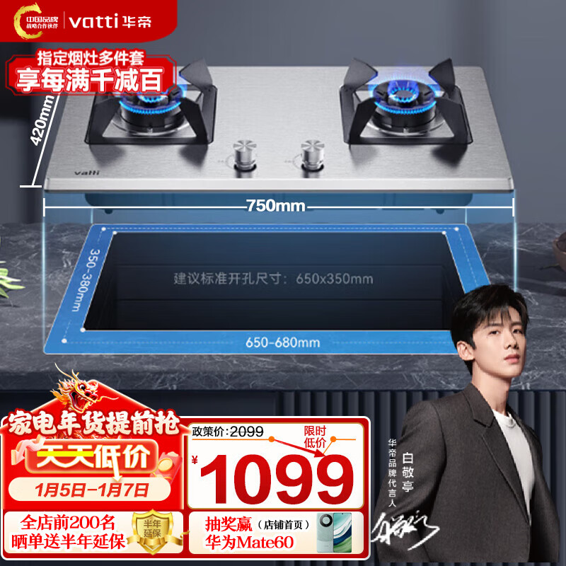 华帝(VATTI)燃气灶天然气双灶具5.0kw大火力华帝官方家用不锈钢灶具台嵌两用双炉头一级能效可调节底盘i10065A 天然气5.0kW以上火力价格:1499.00元!