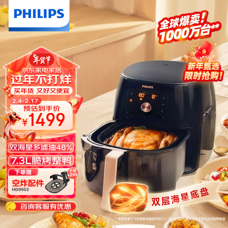 飞利浦(PHILIPS)空气炸锅 家用7.3L双层烤架容量翻倍 减少90%油脂 全自动7倍速热 不用翻面HD9651/61价格:1499.00元!