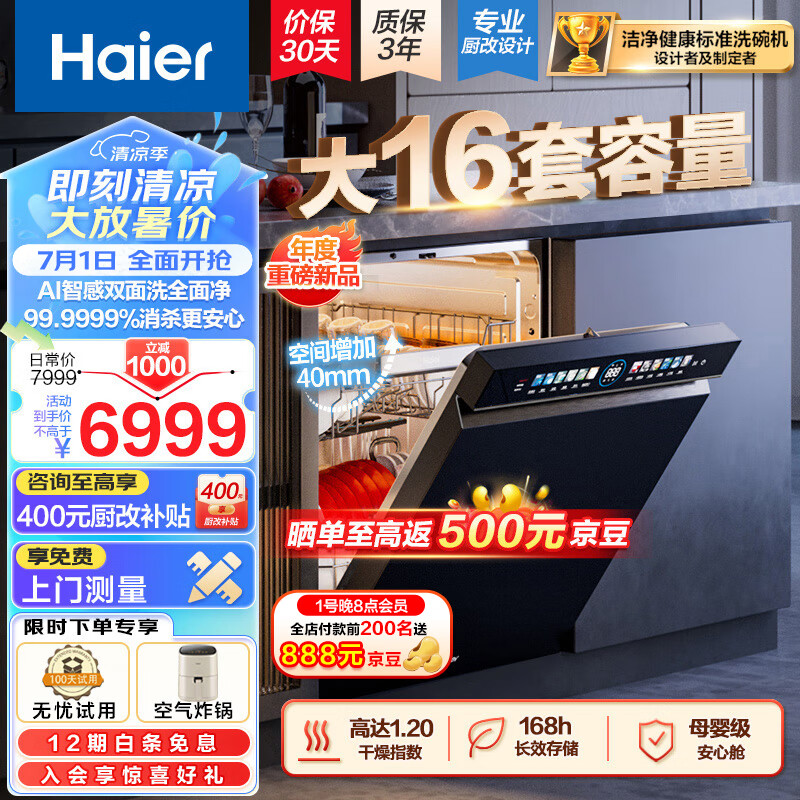 海尔(Haier)双面洗嵌入式健康洗碗机W5000Max 升级大16套 变频分区洗 新一级水效 7天存储EYBW163266GHU1价格:6999.00元!