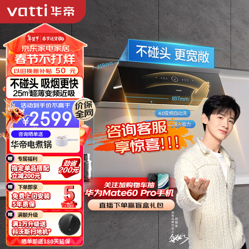 华帝(VATTI)抽油烟机侧吸式家用超薄变频吸油烟机顶侧双吸25立方大吸力挥手智控自清洁脱排油烟机i111A2价格:2799.00元!