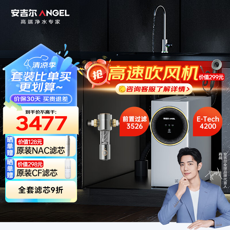 安吉尔净水器家用过滤器套装【E-tech4200+前置过滤器3526】5年RO反渗透厨下式1600G大流速体验价格:3477.00元!