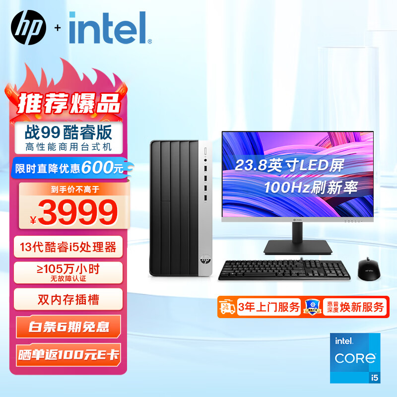 惠普(HP)战99 新款 台式电脑主机 升级14核专业商用高性能CPU 台式机整机 办公设计教育学习 战系列大机箱(13代i5-13500 16G 1TSSD WiFi 蓝牙)23.8英寸大屏显示器价格:3999.00元!
