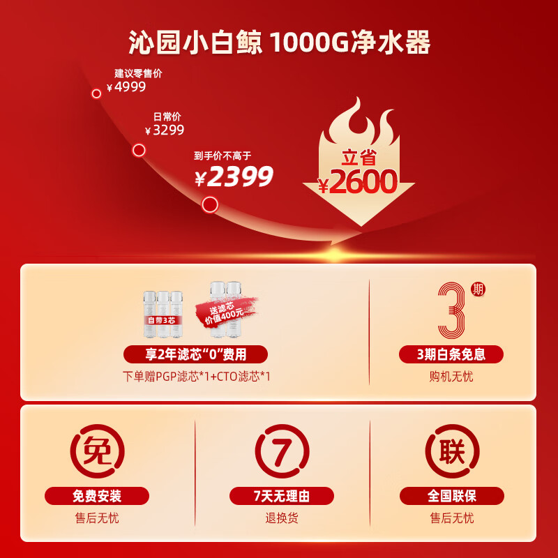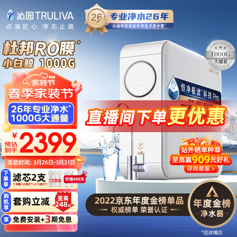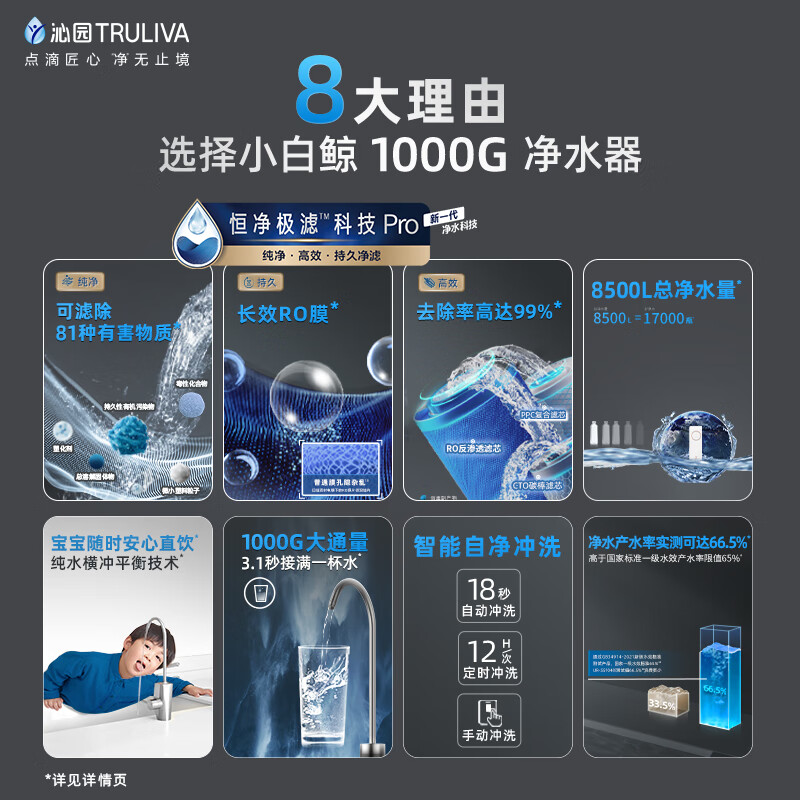 沁园(TRULIVA)小白鲸pro大通量1000G家用净水器长效RO反渗透厨下直饮2.9L/分钟 UR-S51048i价格:2387.00元!