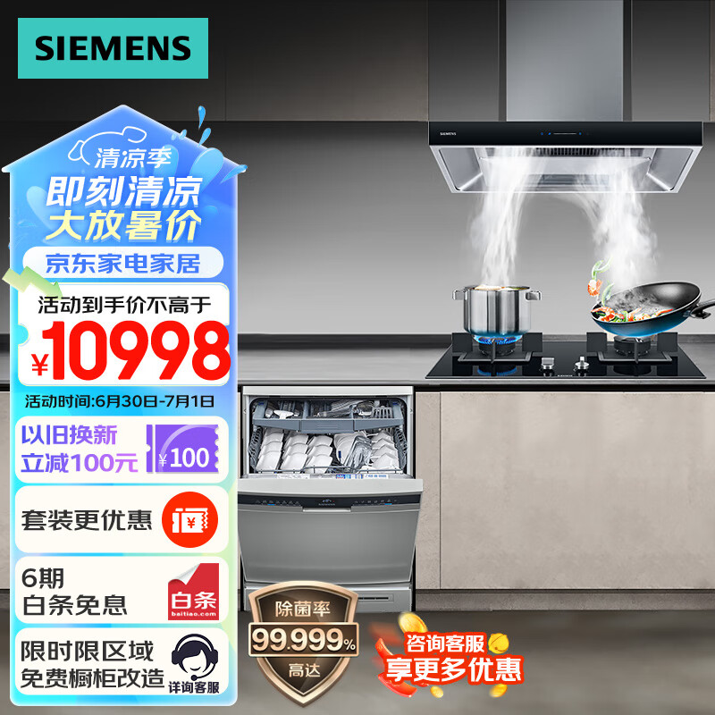 西门子烟灶洗套装 16套大容量家用洗碗机 吸油烟机灶具套装(天然气) SJ23HI88MC+951W+F23MP价格:10998.00元!