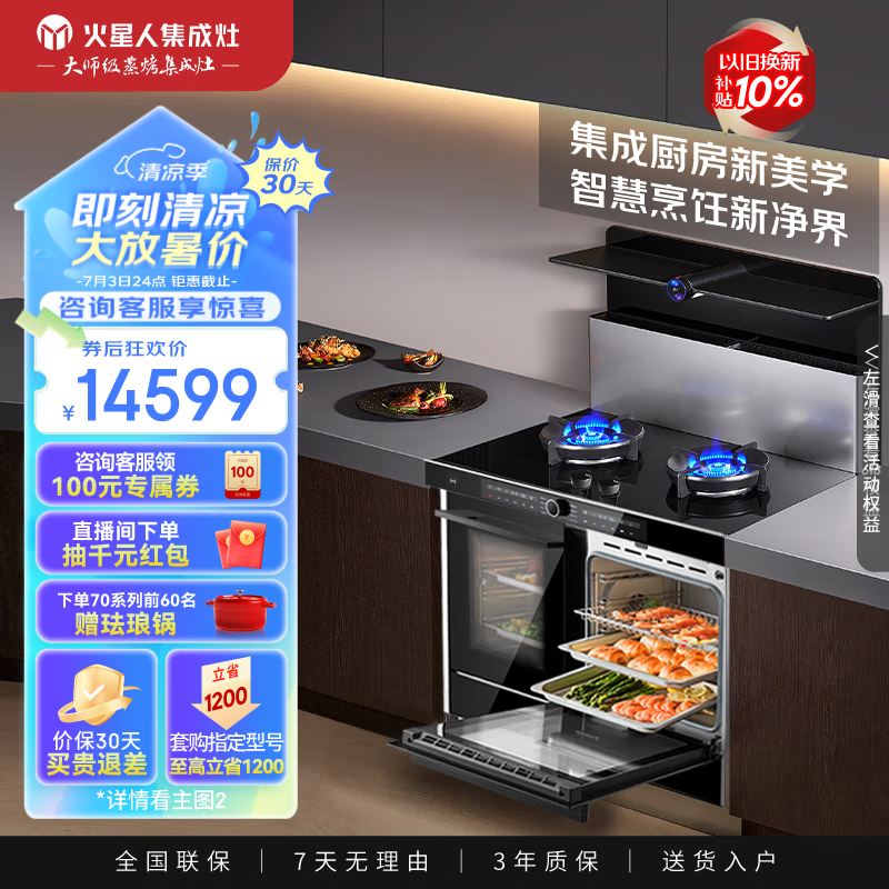 火星人集成灶T70BCZ蒸烤独立集成灶 智能蒸烤炸 家用蒸箱烤箱 燃气灶 天然气价格:14699.00元!