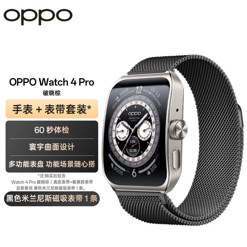 OPPO Watch 4 Pro 破晓棕 全智能手表 男女运动手表 智能健康eSIM电话手表+黑色米兰尼斯表带套装价格:2528.00元!
