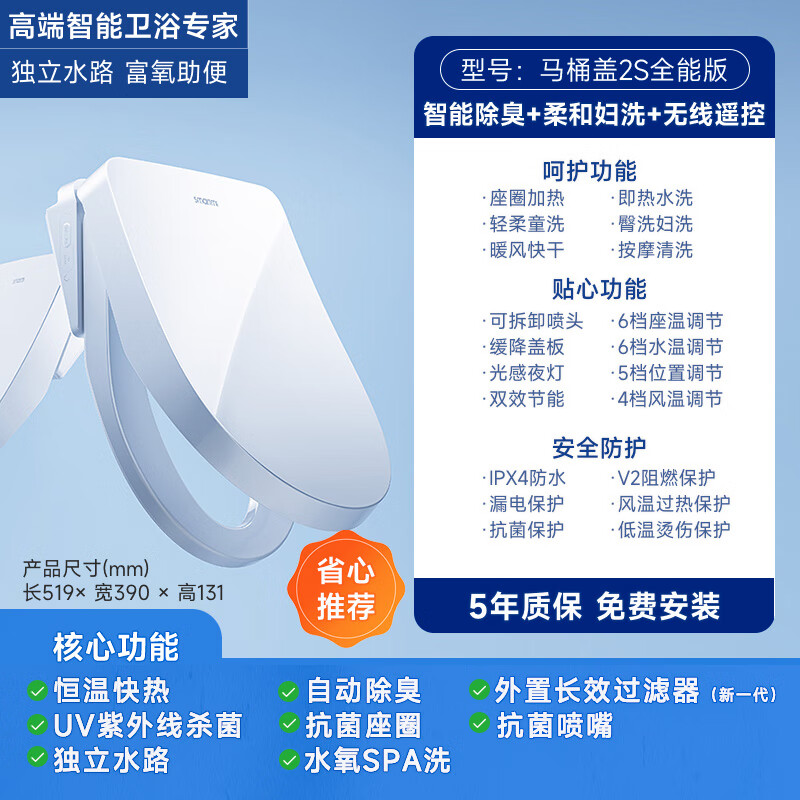 功能:暖风烘干,自动除臭,臀部清洁,座圈加热,座圈感应,喷嘴自洁,喷嘴移动清洗,女性清洗,儿童清洗,记忆功能,净化水质,助老功能,夜灯照明,一键操作